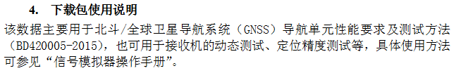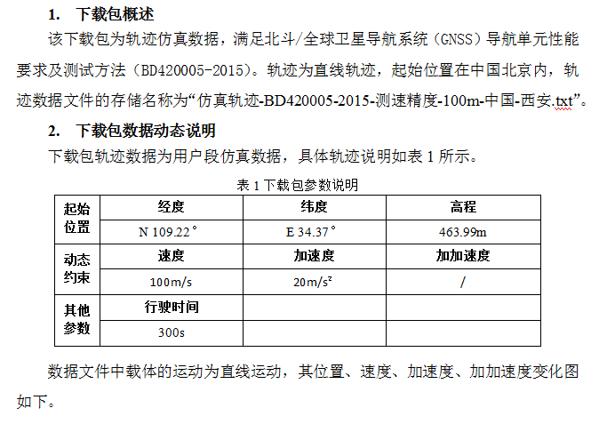 该下载包为轨迹仿真数据,满足北斗/全球卫星导航系统(GNSS)导航单元性能要求及测试方法(BD420005-2015)。轨迹为直线轨迹,起始位置在中国北京内,轨迹数据文件的存储名称为“仿真轨迹-BD420005-2015-测速精度-100m-中国-西安.txt”。